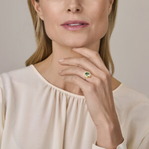 14k Geelgouden ring uitgevoerd met groen amethist. De ring heeft een afmeting van 15×13.5mm.