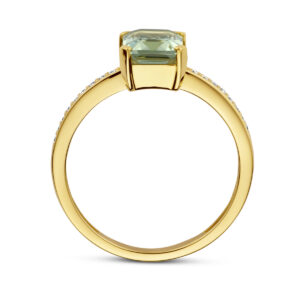 14k Geelgouden ring uitgevoerd met een groen amethist en diamanten rij. De ring heeft een afmeting van 8.5x7mm en de diamantgewicht is 0.07ct.