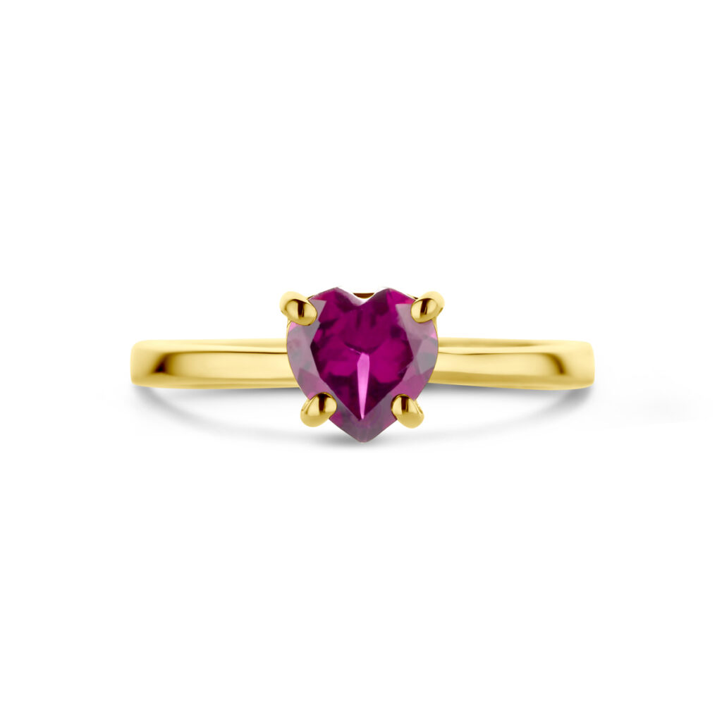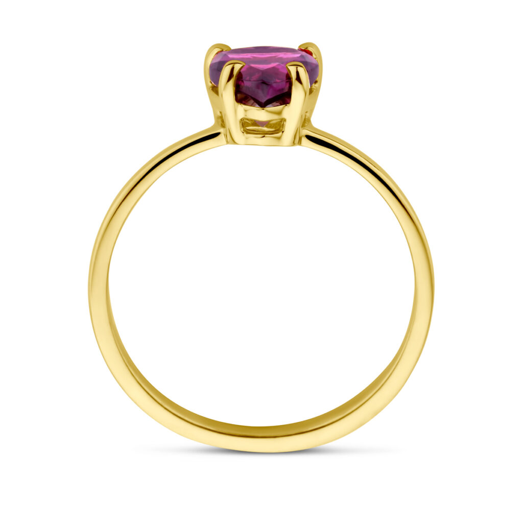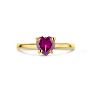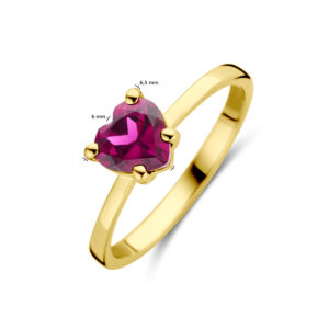 14k Geelgouden ring uitgevoerd met een rhodoliet hart. Het hart heeft een afmeting van 6×6.5mm.