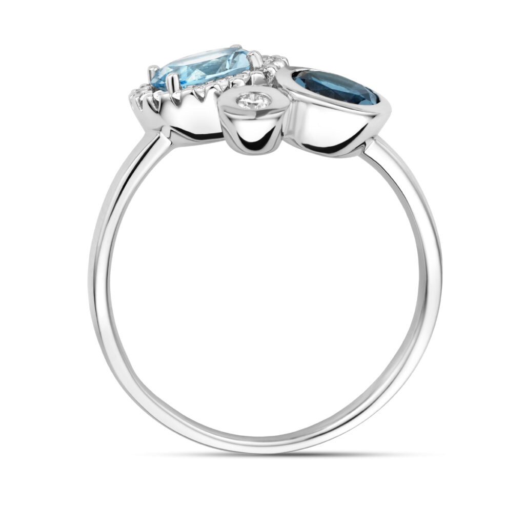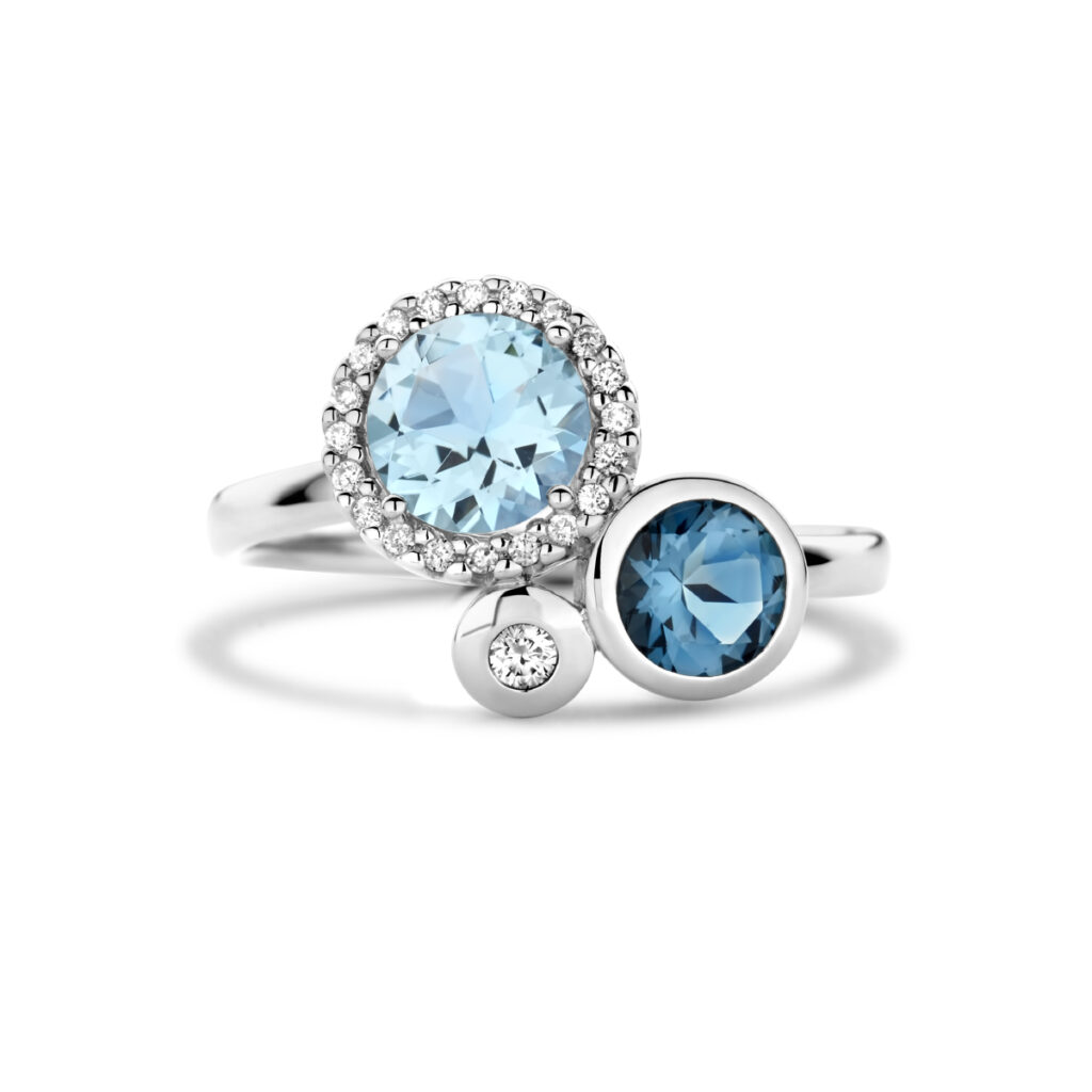 14k Witgouden ring uitgevoerd met schitterende London blue topaas, sky blue topaas en diamant. De ring heeft een breedte van 12mm. De steengewichten zijn: sky blauw topaas 0.18ct en de London blue topaas 0.11ct. Het diamantgewicht is 0.09ct.