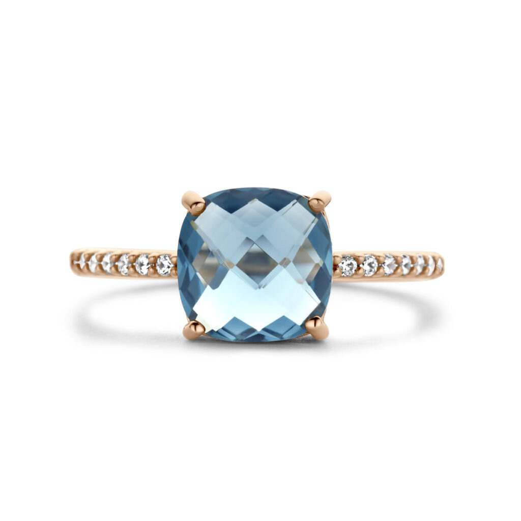14k Rosegouden ring uitgevoerd met een london blue topaas en zirkonia. De topaas heeft een afmeting van 8x8mm.