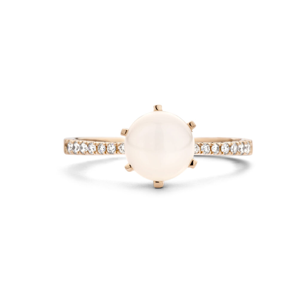 14k Rosegouden ring uitgevoerd een schitterende diamant rij en wit maansteen.