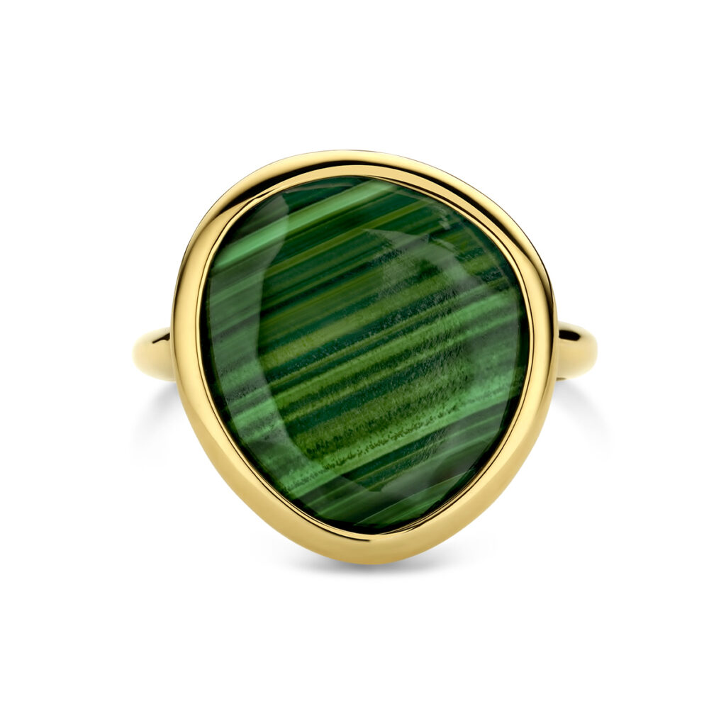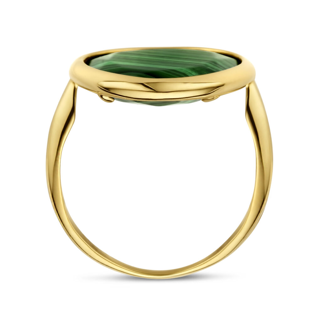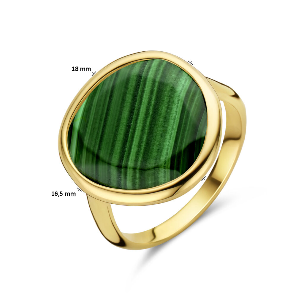 14k Geelgouden ring uitgevoerd met malachiet. De ring heeft een breedte van 18mm.