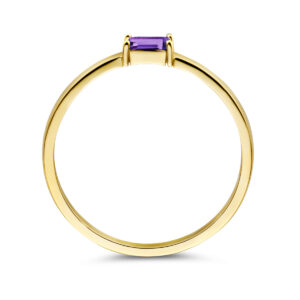 14k Geelgouden ring uitgevoerd met een schitterende amethist. De ring heeft een breedte van 2.5mm.