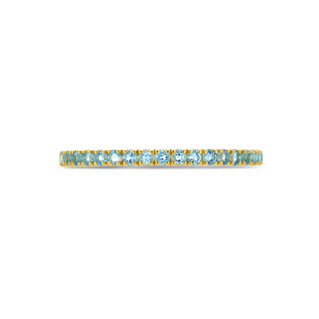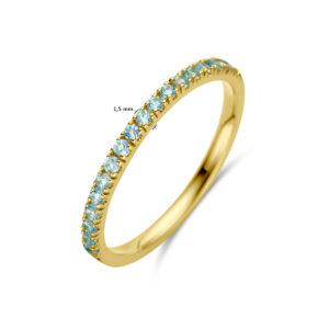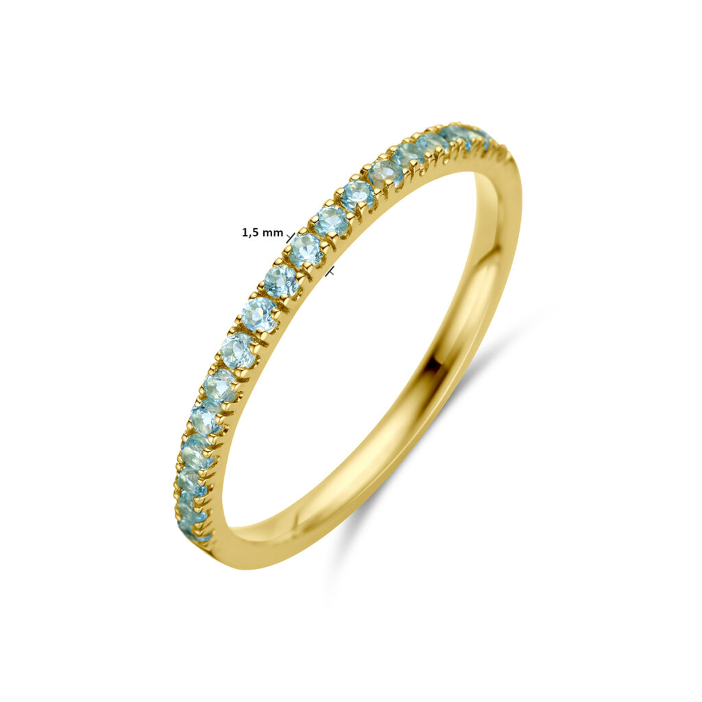 14k Geelgouden ring met geboortesteen uitgevoerd met blauw topaas. De ring heeft een breedte van 1.5mm.