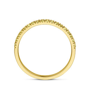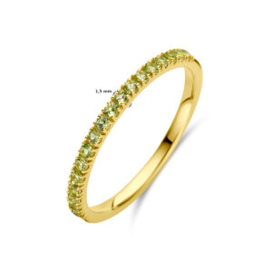 14k Geelgouden ring met geboortesteen uitgevoerd met peridoot. De ring heeft een breedte van 1.5mm.