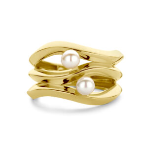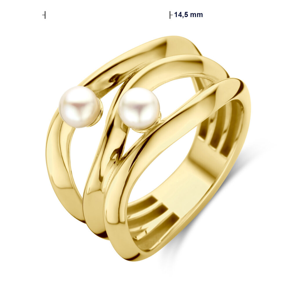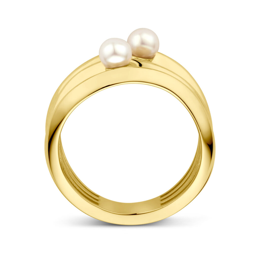 14k Geelgouden ring uitgevoerd met twee zoetwaterparels. De ring heeft een breedte van 14.5mm en de parel heeft een diameter van 4mm.