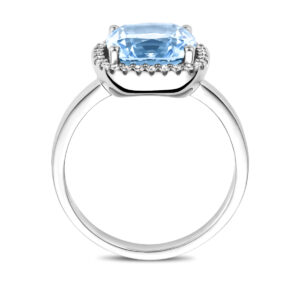 14k Witgouden ring uitgevoerd met sky blue topaas en diamant. De ring heeft een afmeting van 12x12mm. Het totale diamantgewicht is 0.14ct.