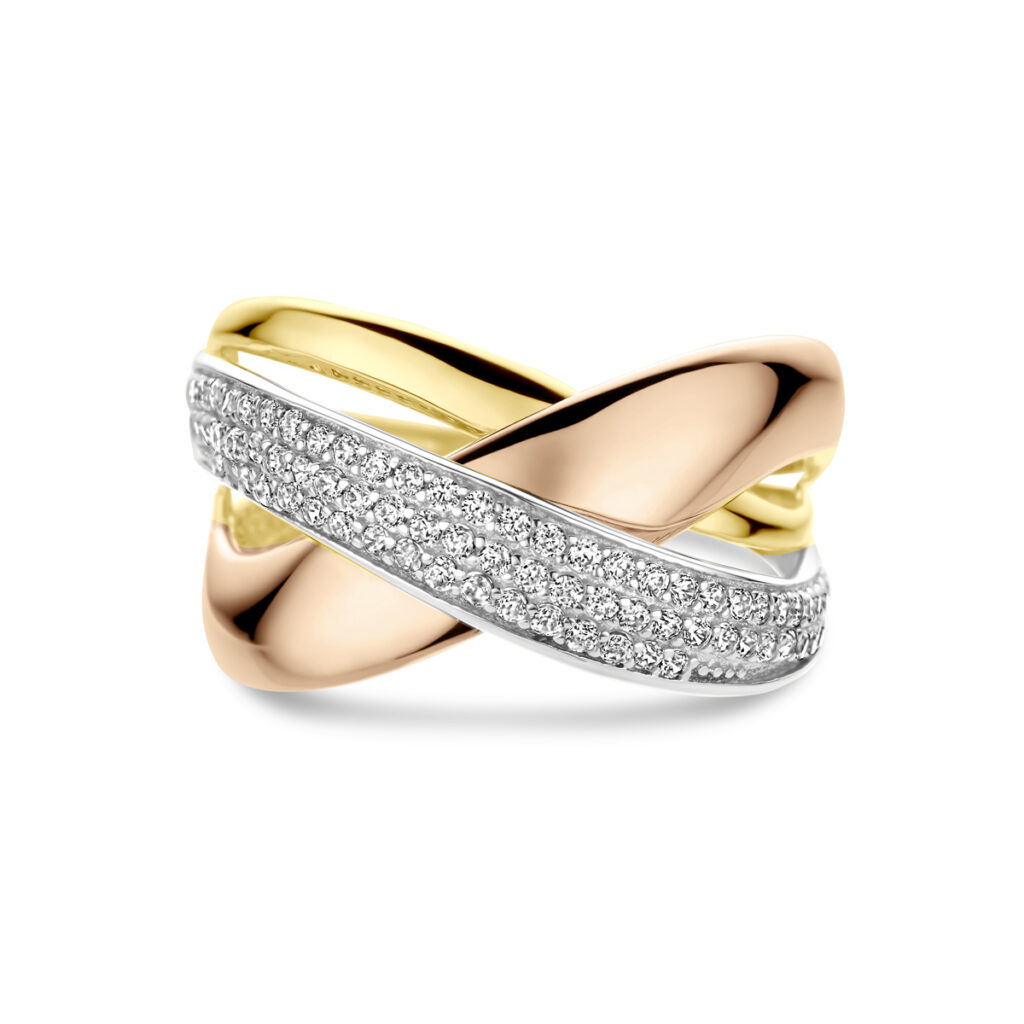14k Tricolor wit- rose- en geelgouden ring uitgevoerd met zirkonia. De ring heeft een breedte van 12mm.