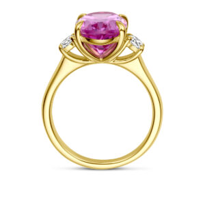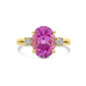 14k Geelgouden ring uitgevoerd met lab grown roze saffier en lab grown diamanten. De ring heeft een afmeting van 12x9mm en het diamantgewicht is 0.35ct. Lab grown diamanten zijn diamanten die ontstaan in een laboratorium. Onder extreem hoge druk en temperatuur wordt het natuurlijk ontstaansproces nagebootst met als eindresultaat een diamant met dezelfde chemische eigenschappen maar met een andere oorsprong.