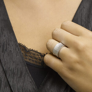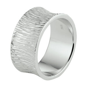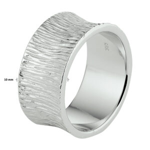 Stijlvolle gerhodineerd zilveren ring met een bijzonder structuur design. De ring heeft een breedte van 10mm. Info: Gerhodineerd zilver is door de rhodiumlaag beter bestand tegen verkleuren en krassen.