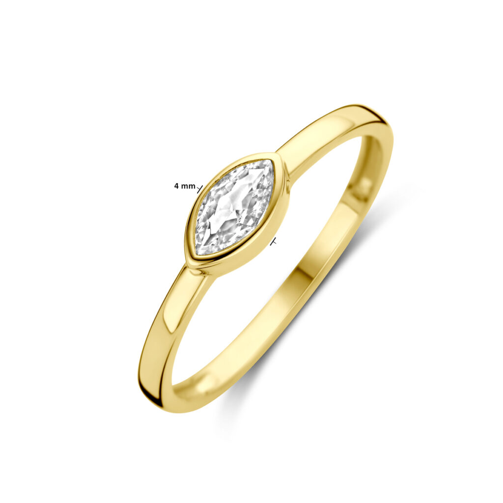 14k Geelgouden ring uitgevoerd met zirkonia. De ring heeft een afmeting van 4×7.5mm.
