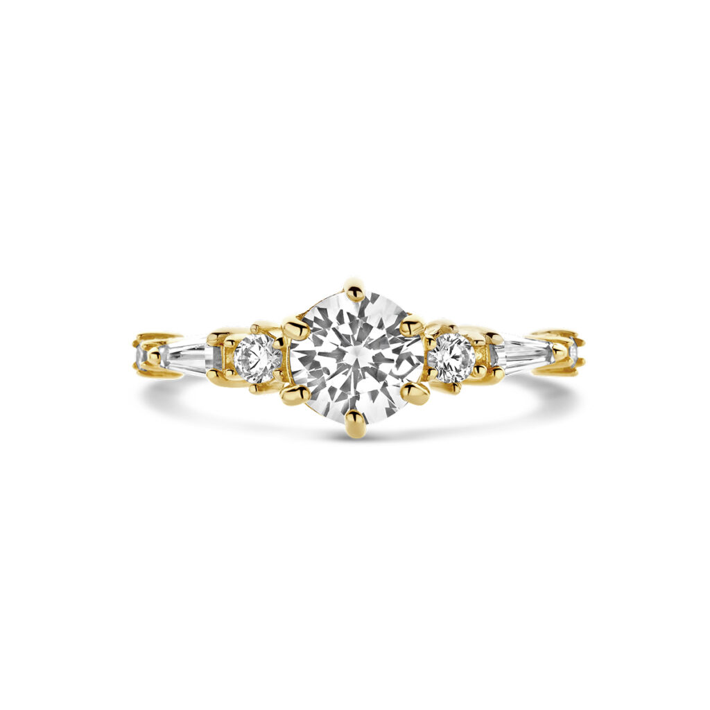 14k Geelgouden ring uitgevoerd met zirkonia. De ring heeft een breedte van 7.5mm.