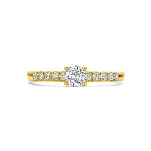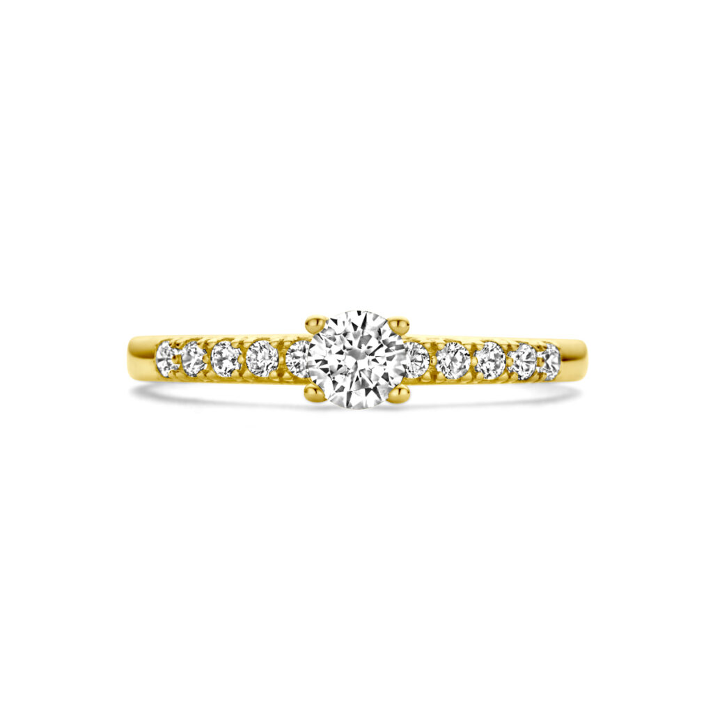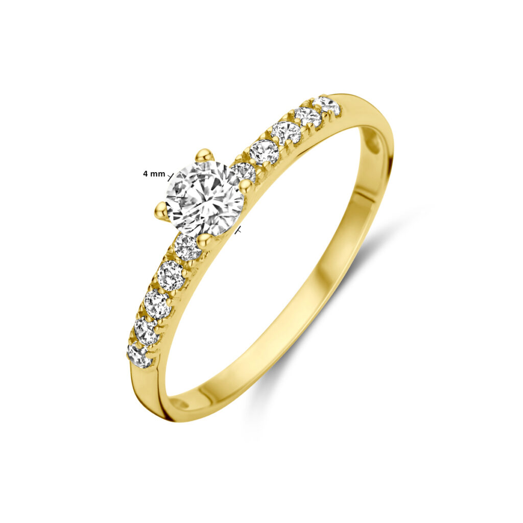 14k Geelgouden ring uitgevoerd met zirkonia. De ring heeft een breedte van 4mm.