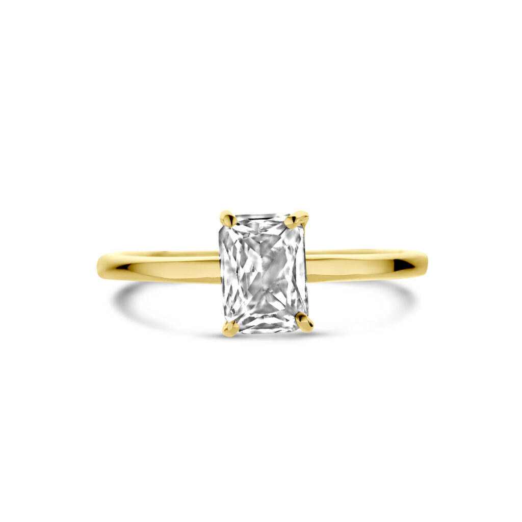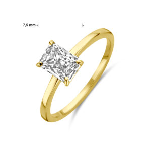 14k Geelgouden ring uitgevoerd met zirkonia. De ring heeft een breedte van 7.5mm.