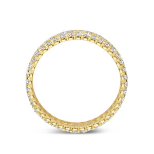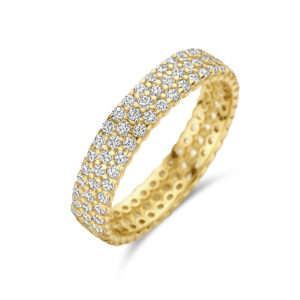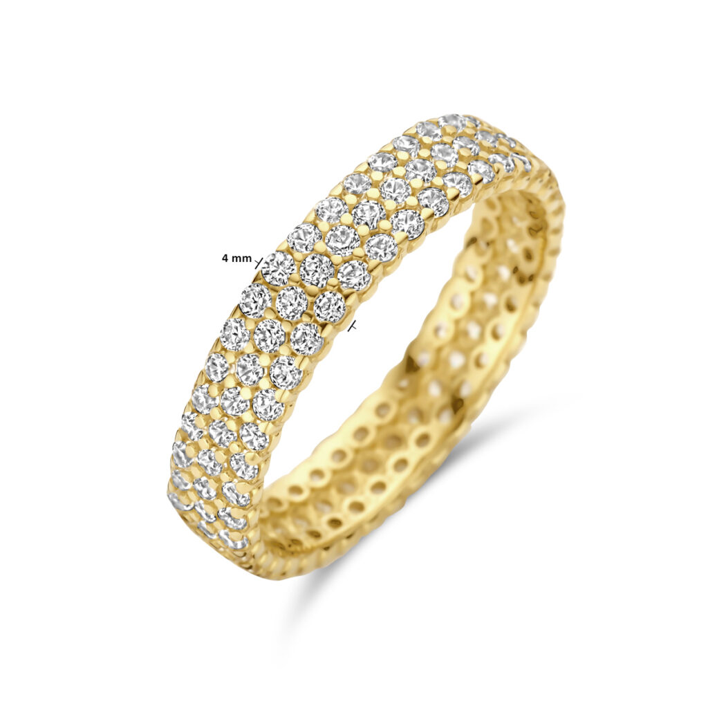 14k Geelgouden ring uitgevoerd met zirkonia. De ring heeft een breedte van 4mm.