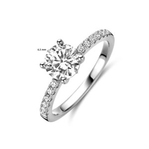 Gerhodineerd 925 zilveren ring uitgevoerd met zirkonia. De steen heeft een diameter van 6.5mm.
