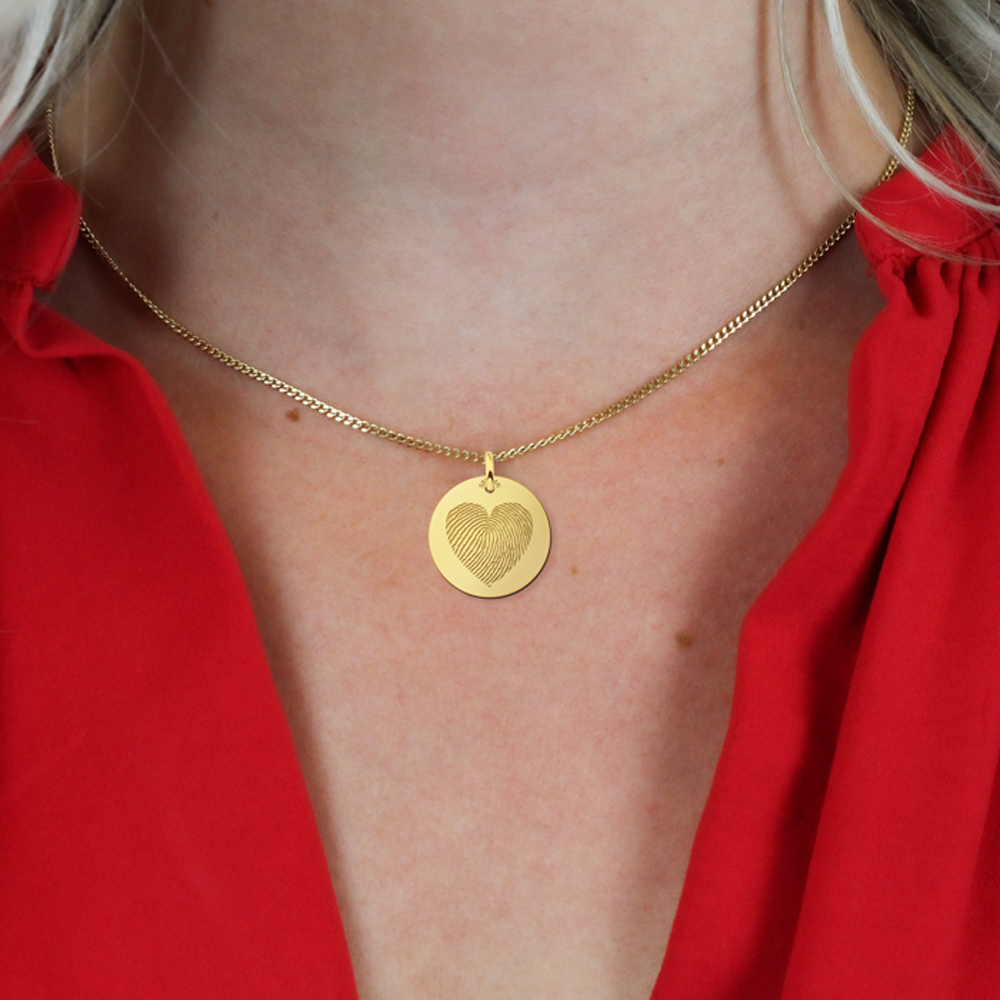 Deze ronde hanger met hartvormige vingerafdruk is gemaakt van 14 karaats goud, de allerbeste kwaliteit goud, met een fijntjes gepolijst oppervlak dat mooi glanst. Deze hanger bestaat uit een slank oogje waar u gemakkelijk een ketting naar keuze doorheen haalt, met daaronder een rond plaatje met in het midden ruimte voor een te graveren vingerafdruk die in de vorm van een hartje gegraveerd zal worden. Zo bent u verzekerd van een persoonlijk en uniek sieraad. Deze hanger heeft een diameter van 16mm met een dikte van 0,4mm.