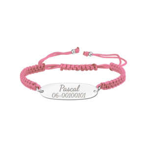 Deze Roze Koordarmband met Naam/Nummer van Names4ever is gemaakt van roze koord met in het midden een 925 sterling zilveren naamplaatje met daarop ruimte voor een te graveren naam en telefoonnummer. De armband heeft een lengte van 13,5cm tot 16cm en het zilveren naamplaatje heeft een afmeting van 30×8,5mm.