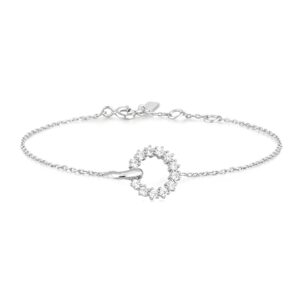 Deze sprankelende cirkelvormige hanger, doorsneden met een gepolijste kromming, maakt deze armband een perfect middelpunt om elke pols.