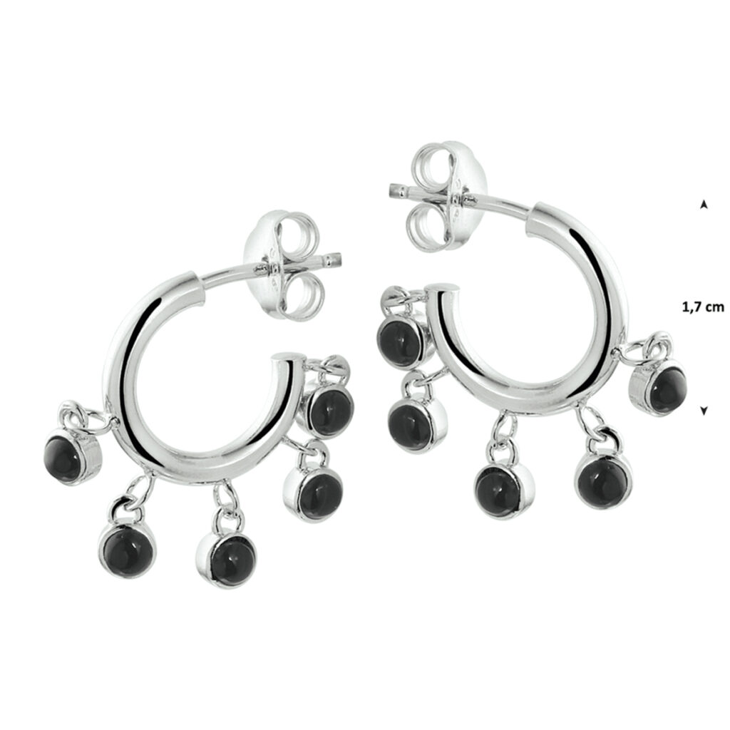 Trendy gerhodineerd zilveren stekeroorringen met een hoogte van 17mm. Uitgevoerd met onyx stenen in 5 poli afgewerkte zetkasten met een diameter van 3mm. Tip: Leuk om kado te geven! Zie je ze al stralen? Info: Gerhodineerd zilver is door de rhodiumlaag beter bestand tegen verkleuren en krassen.