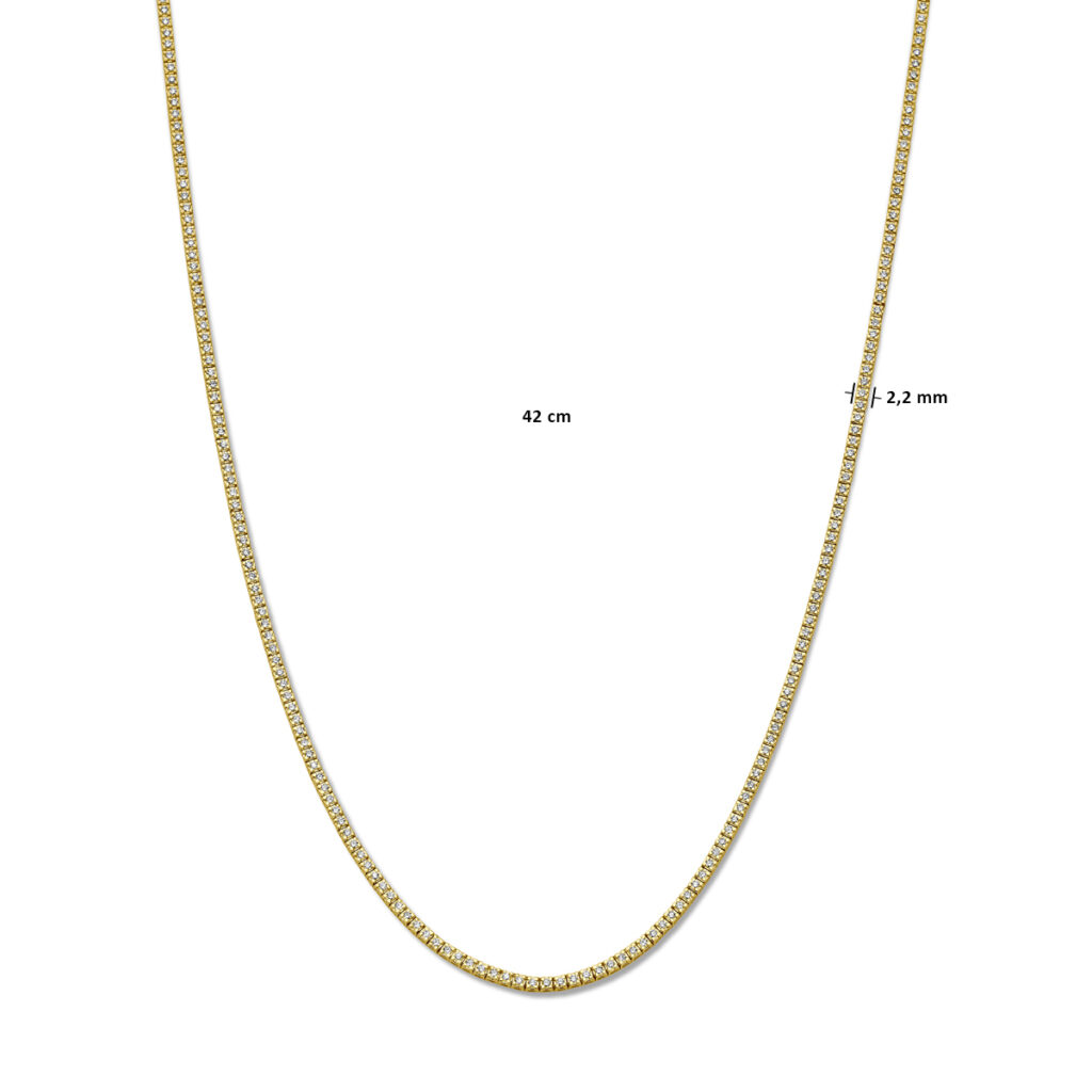 14k Geelgouden tenniscollier uitgevoerd diamanten. Het tenniscollier heeft een draaglengte van 42cm en een schakelbreedte van 2.2mm. Het diamantgewicht is 3.00ct.