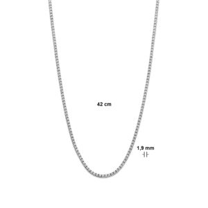 14k Witgouden tenniscollier uitgevoerd met lab grown diamanten. Het tenniscollier heeft een draaglengte van 42cm en een schakelbreedte van 1.9mm. Het diamantgewicht is 2.00ct. Lab grown diamanten zijn diamanten die ontstaan in een laboratorium. Onder extreem hoge druk en temperatuur wordt het natuurlijk ontstaansproces nagebootst met als eindresultaat een diamant met dezelfde chemische eigenschappen maar met een andere oorsprong.