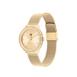 Dit specifieke horloge van Tommy Hilfiger uit de Demi serie met artikelnr: TH1782699 is een luxe dameshorloge die niet in je collectie mag ontbreken. Het stalen dameshorloge heeft een ronde goudkleurige kast met een bezel vol kristallen en een goudkleurige sunray wijzerplaat. De uren worden tevens weergegeven met kristallen. De goudkleurige milanese band is op lengte verstelbaar en heeft een klapsluiting. Het horloge heeft een mineraalglas, een doorsnee van 33mm en is 3ATM.