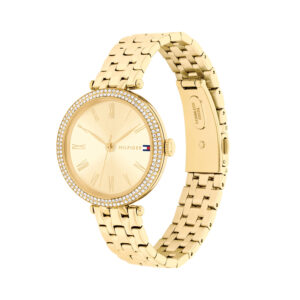 Dit specifieke horloge van Tommy Hilfiger uit de Nathalie serie met artikelnr: TH1782718 is een luxe dameshorloge die niet in je collectie mag ontbreken. Het tommy hilfiger dames horloge heeft een ronde goudkleurige kast met een bezel met 2 rijen kristallen en een goudkleurige sunray wijzerplaat met romeinse cijfers en hele sierlijke wijzers. Aan de kast zit een fijne goudkleurige schakelband met een speciale aanzet. Het horloge heeft een mineraalglas, een doorsnee van 34mm en is 3ATM.