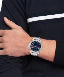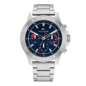 Dit specifieke horloge van Tommy Hilfiger uit de Bryan serie met artikelnr: TH1792113 is een stoer sportief herenhorloge die niet in je collectie mag ontbreken. Het stalen herenhorloge heeft een ronde kast met een blauwe halfglimmende wijzerplaat met dag,- datum, en 24-uursaanduiding en rode accenten. De wijzers zijn ingelegd met lumibrite. Aan het horloge zit een zilverkleurige schakelband. Het horloge heeft een mineraalglas, een doorsnee van 46mm en is 5ATM.
