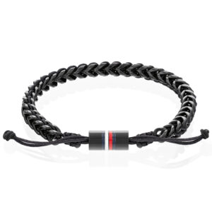 Deze edelstalen herenarmband van Tommy Hilfiger combineert gepolijste zwarte schakels met een zwarte gevlochten veter voor een stoere look. De armband is voorzien van een zwarte sluiting met het Tommy Hilfiger-logo in kleur als subtiel detail. Met een lengte van 19,5 cm, een hoogte van 9 mm, en een gewicht van 98 gram, biedt deze herenarmband een comfortabele pasvorm en een stijlvolle uitstraling voor dagelijks gebruik.