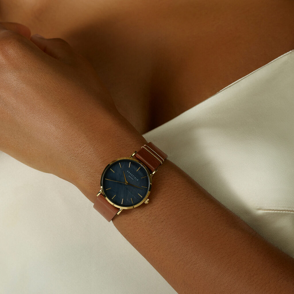 Dit Rosefield horloge uit de West Village-collectie heeft een eigentijds ontwerp. De stalen horlogekast van 33 mm is goudkleurig en bevat een zwarte parelmoer (MOP) wijzerplaat, die een uniek contrast geeft. De cognackleurige leren band maakt dit dameshorloge tot een opvallend accessoire. Dit horloge is geschikt voor dagelijks gebruik en combineert moeiteloos met diverse outfits, waardoor het een veelzijdige keuze is voor elke gelegenheid.