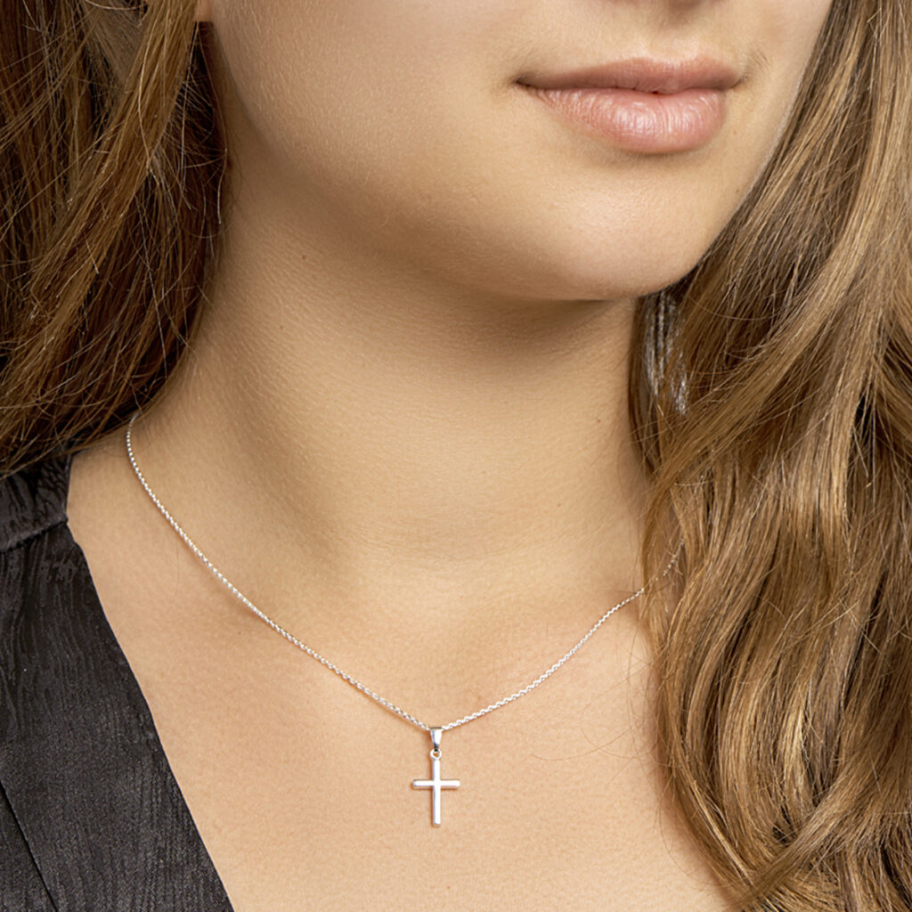 Dit zilveren ketting met kruis hanger is volledig gemaakt van 925 sterling zilver, de allerbeste kwaliteit zilver, en voorzien van een hangertje met een breedte van 10mm en een hoogte van 15mm. Deze zilveren dames ketting met kruis bestaat uit een slank collier met fijne anker schakels, voorzien van een elegante hanger in de vorm van een heilig kruis. Een subtiel en betekenisvol sieraad dat perfect is voor dagelijks gebruik of als symbolisch cadeau. Deze kruisketting is bijzonder leuk als cadeau om te geven en om te krijgen. Dit zilveren collier met kruis hanger heeft een totale lengte van 45cm en kan gemakkelijk ingekort worden naar 41cm. De anker schakels van dit collier hebben een breedte van 1,1mm.