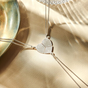 Deze driedelige hanger is volledig gemaakt van 925 sterling zilver, de allerbeste kwaliteit zilver, en afkomstig van het merk Names4ever. Deze driedelige hanger is voorzien van een fijntjes gepolijst oppervlak dat mooi glanst en kan volledig gepersonaliseerd worden door middel van een door u aan te leveren vingerafdruk. Deze vingerafdruk wordt aan de voorkant van de hartvormige driedelige hanger geplaatst, waardoor het hartje en de vingerafdruk pas compleet zijn wanneer jullie alle drie bij elkaar zijn. Deze beeldschone driedelige hanger heeft een afmeting van 22x21mm en wordt geleverd inclusief drie kettingen met een lengte van 45-50cm.