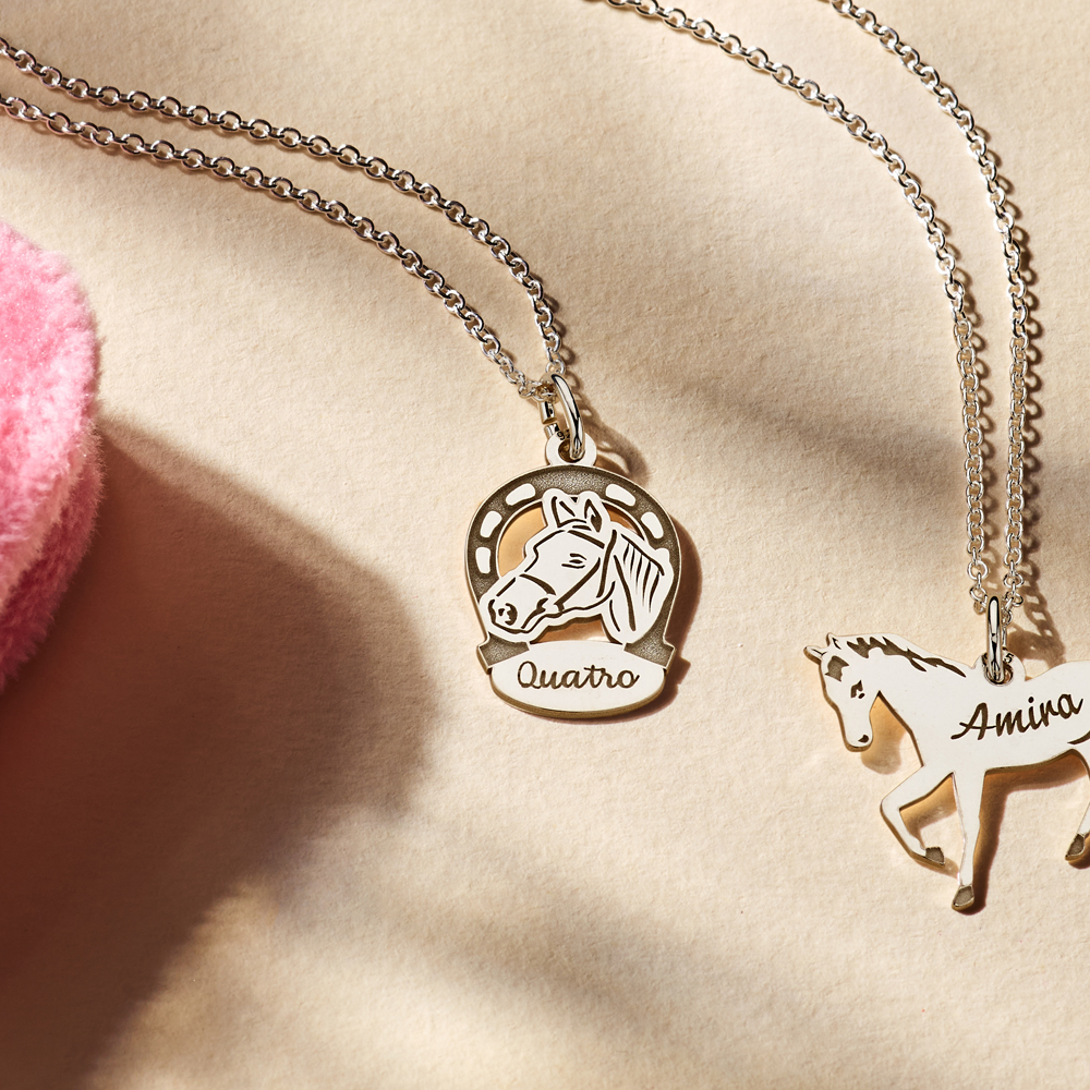 Zilveren hanger hoefijzers en paard met naam – Names4ever
