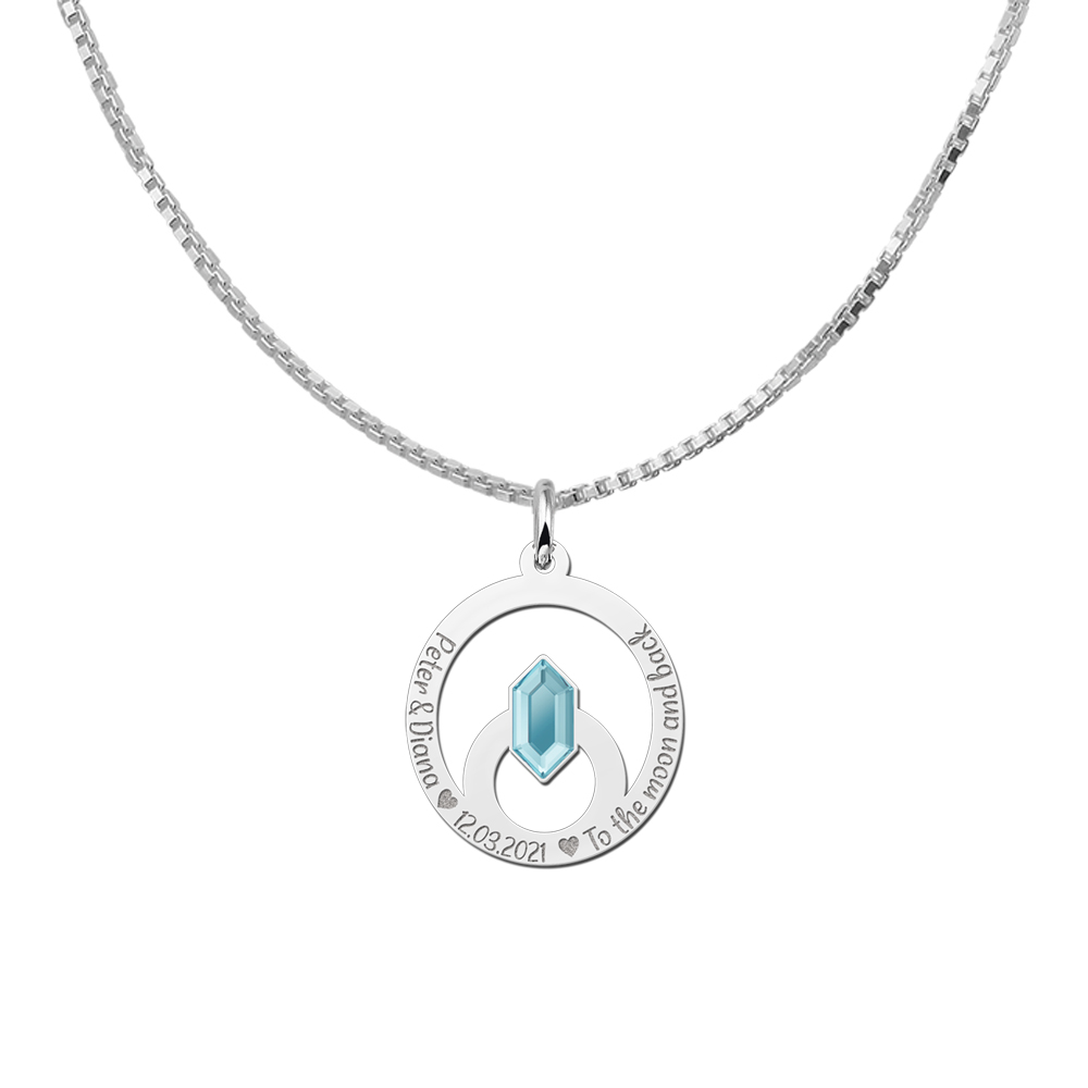 Deze Zilveren Ronde Hanger met Kleurige Swarovski Baguette is vervaardigd uit 925 Sterling zilver in de vorm van een rondje in een rondje met op het onderste rondje een baguette vormige Swarovski steen in de kleur: Aquamarijn, Zwarte Diamant, Kristal, Kristal Zilver Schaduw of Rood. De hanger heeft een afmeting van 20 x 21 mm bij een dikte van 0,7 mm en kan worden voorzien van een gravure van maximaal 55 tekens. De Zilveren Ronde Hanger met Kleurige Swarovski Baguette wordt geleverd inclusief een mooi cadeauverpakking en kan worden besteld met en zonder bijpassende Swarovski zilveren ketting.