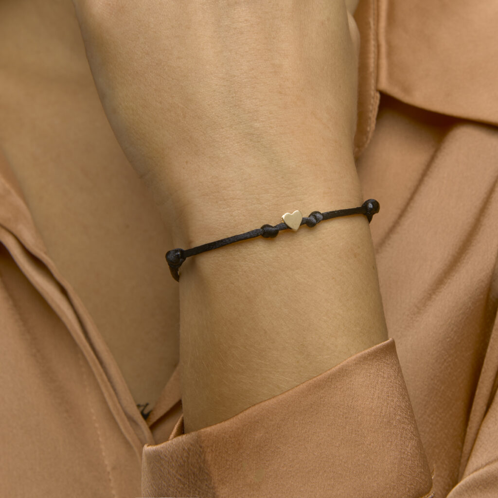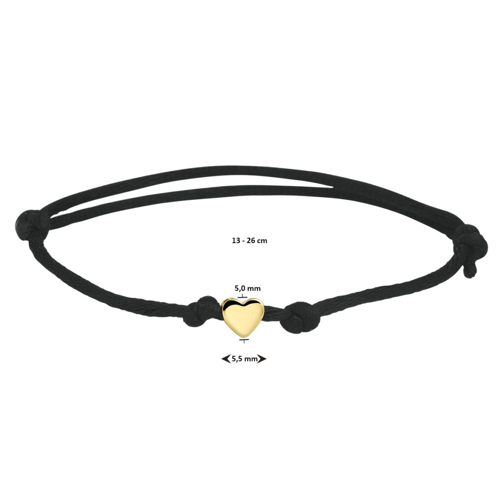 Zwart gevlochten armband uitgevoerd met een 14k geelgouden hartje. De armband heeft draaglengtes van 13 tot 26cm. Het hartje heeft een afmeting van 5×5.5mm.