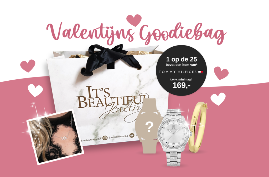 Voor € 20,00 per stuk zijn de Valentijns Mystery Goodiebags al te koop. Maar wanneer je de waarde van alle artikelen van de goodiebag bij elkaar optelt, kom je uit op een waarde van ten minste € 60,00. Deze waarde bestaat voor een deel uit sieraden en voor een deel uit een cadeaubon en een waardebon. Bovendien heeft juwelier It’s Beautiful een leuke Valentijns accessoire aan iedere goodiebag toegevoegd!